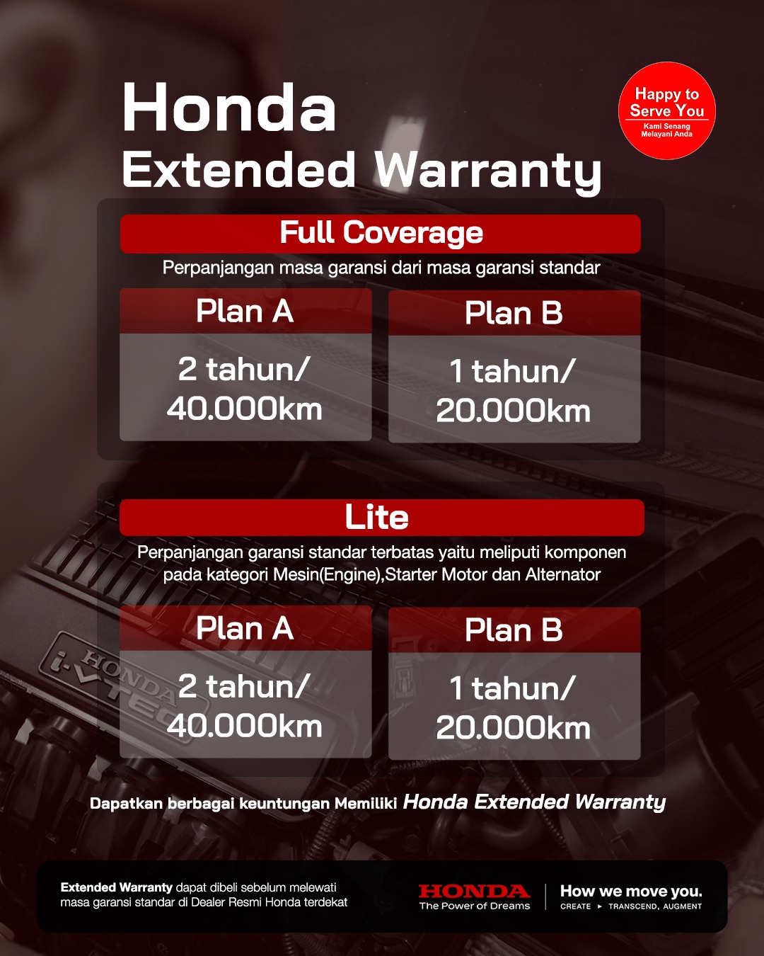 Tersedia pilihan Full Coverage dan Lite, dengan perpanjangan hingga 2 tahun / 40.000 km.